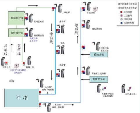 效率科技所提供的MES系統(tǒng)是結(jié)合A公司拖拉機生產(chǎn)區(qū)的企業(yè)局域網(wǎng)的總體的規(guī)劃要求、生產(chǎn)管理及調(diào)度流程標準、企業(yè)工藝編碼規(guī)則,建立的一個技術(shù)先進適用、運行安全可靠的網(wǎng)絡(luò)體系。MES系統(tǒng)通過車體條碼數(shù)據(jù)采集管理,實現(xiàn)車體的實時的流轉(zhuǎn)跟蹤,為保證總裝和分裝線節(jié)拍的一致、了解和調(diào)度車間生產(chǎn)提供了可視化平臺;通過裝配線邊的觸摸屏動態(tài)顯示線上主機的裝配指示,減少錯漏裝現(xiàn)象,提高裝配質(zhì)量;通過對關(guān)重件的掃描管理,實現(xiàn)拖拉機生產(chǎn)履歷的及時和準確的記錄,為實現(xiàn)質(zhì)量追溯以及及時召回提供支持;通過對裝配線的啟停記錄和原因統(tǒng)計分析,實際對兩條主裝配線效率的分析。同時,由于A公司拖拉機生產(chǎn)區(qū)是一個全新的運行模式,因此,MES系統(tǒng)充分考慮了系統(tǒng)的開放性與可擴充性的能力,網(wǎng)絡(luò)系統(tǒng)能在生產(chǎn)運行過程中,能夠具有不斷摸索、持續(xù)改進、充實完善的能力。